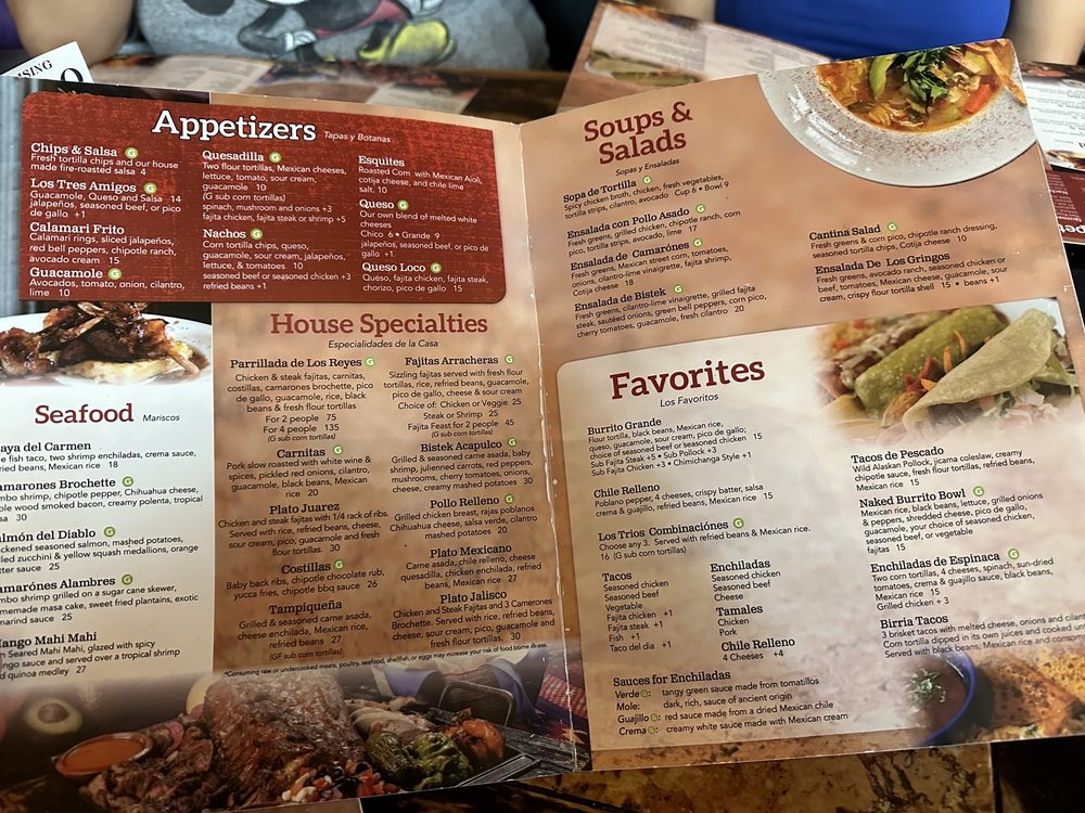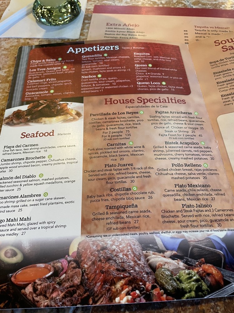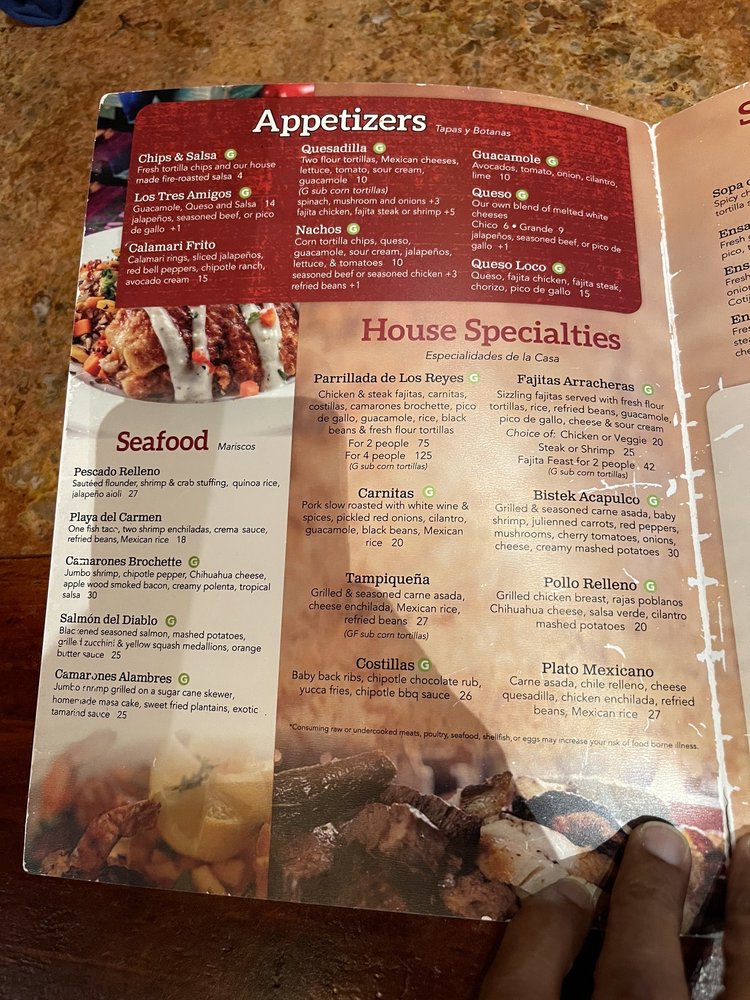 Chicken & Steak fajitas, carnitas (slow roasted pork), costillas (ribs), camerones brochette (stuffed shrimp wrapped in bacon) pico de gallo, guacamole, rice, black beans and fresh flour tortillas.