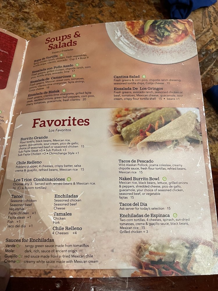 Two corn tortillas filled with 4 cheeses, spinach, and sun-dried tomatoes. Topped with creama and Guajillo sauce and served with Mexican rice and black beans.